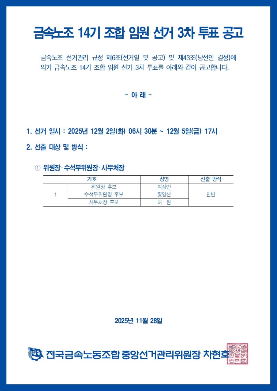 [공지] 금속노조 14기 조합 임원 선거 3차 투표 공고