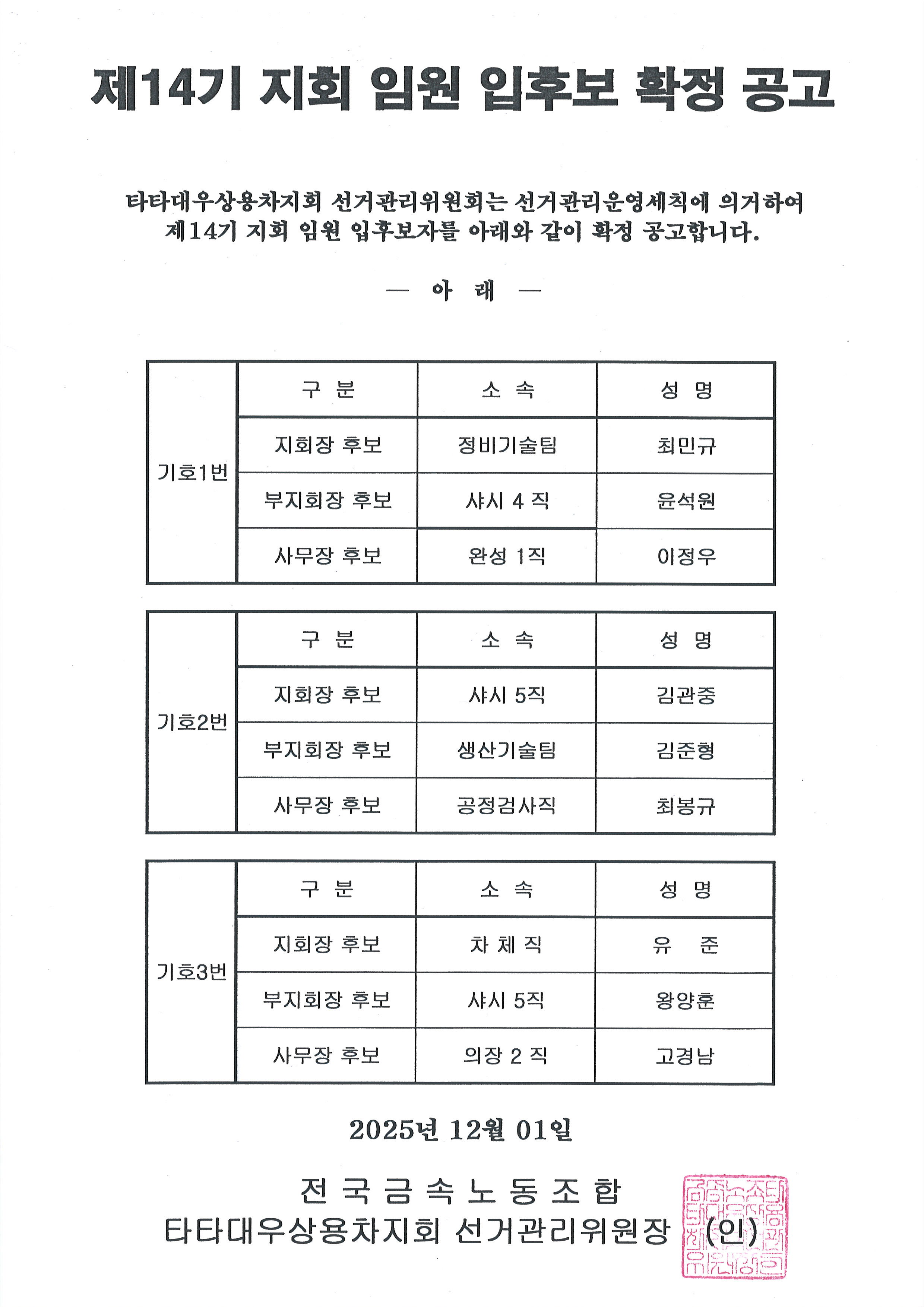[공지] 금속노조 14기 조합 임원 선거 당선인 결정 공고