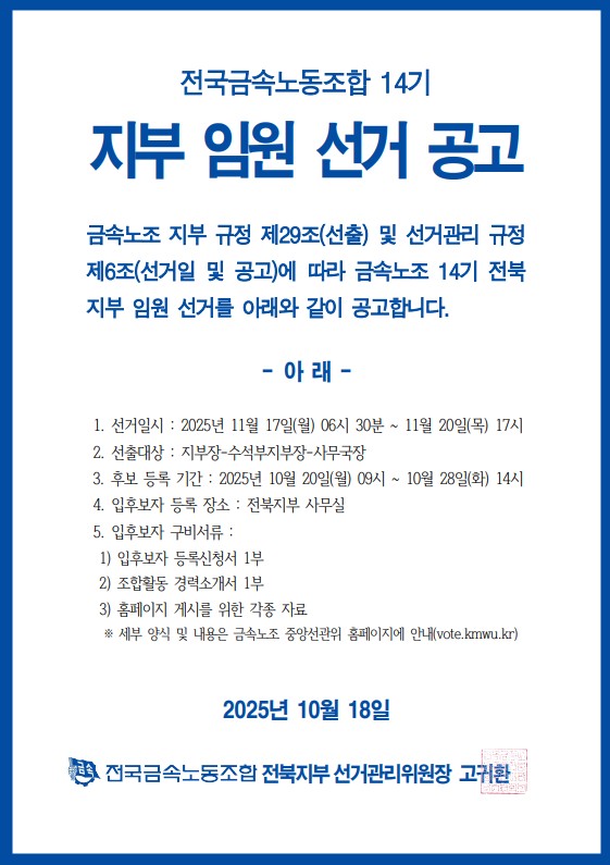[공지] 전국 금속 노동조합 14기 전북지부 임원 선거 입후보자 공고