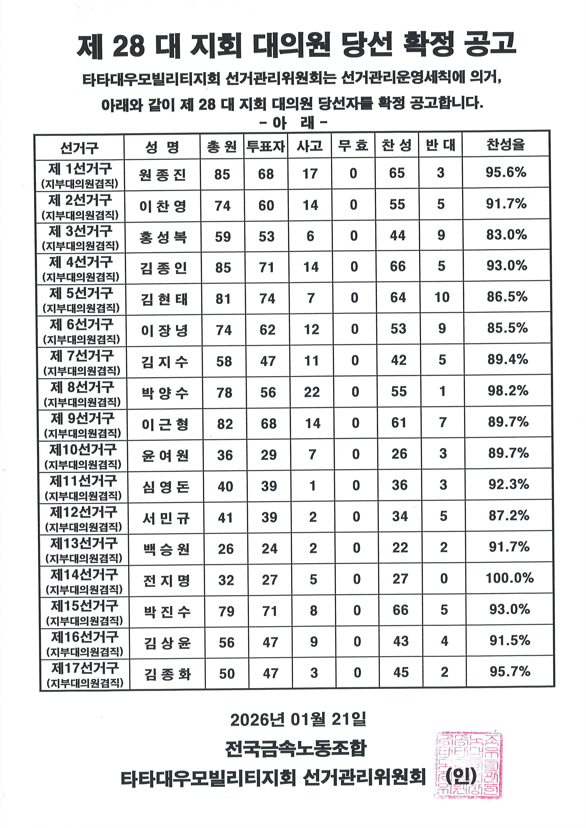 [공지] 2026년 전국금속노동조합 본조 대의원 당선확정 공고